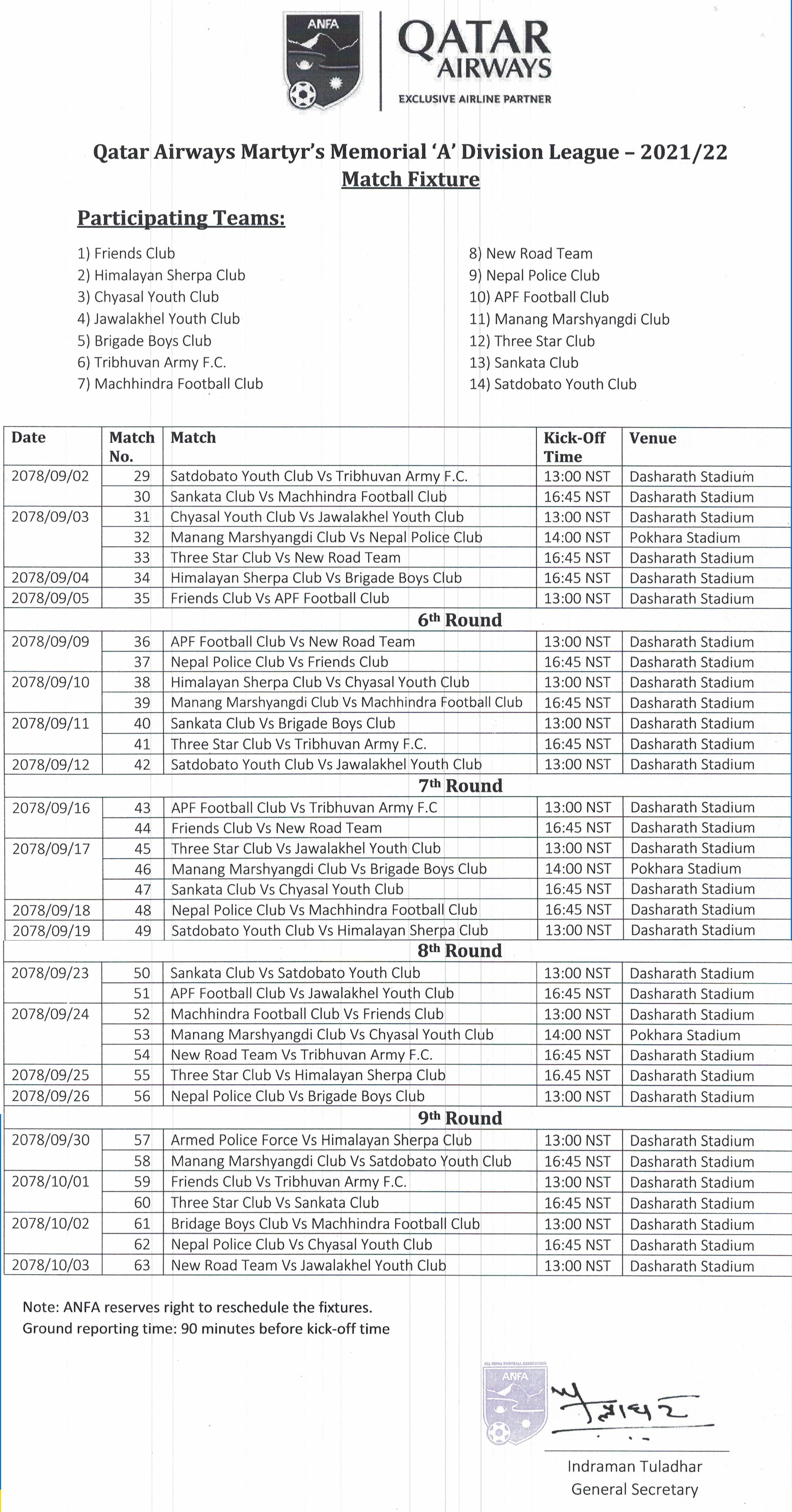 MMC's matches against Nepal Police Club (5th round), Brigade Boys Club (7th round) and Chyasal Youth Club (9th round) will be played in Pokhara.