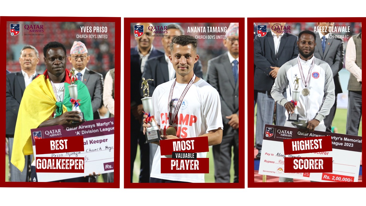 API Power Church Boys United's Ananta Tamang won the Most Valuable Player of the Tournament of the Qatar Airways Martyr's Memorial A Division League 2023.