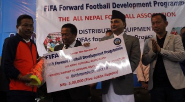 The All Nepal Football Association distributed football equipment and funds to all the affiliated 45 districts for grassroots development, at the ANFA Complex, on Tuesday.All the 45 district football associations were provided equipment worth Rs. 100,000 each and Rs. 500,000 each for infrastructure development. Of the 45 districts, 10 hills districts were provided Rs. 500,000 extra considering the expensiveness in building infrastructure due to difficult land terrains.The 10 districts are Baglung, Dhankuta, Dolakha, Illam, Kavre, Lamjung, Palpa, Panchthar, Sindhupalchowk and Syanjga. ANFA Vice President and Grassroots Coordinator Upendraman Singh delivered a presentation about grassroots football to Chief Guest Ishwar Pokhrel, Defense Minister, and representatives of the 45 district football associations before making a commitment to work more for the cause. Minister Pokhrel said he was delighted by the initiative taken by the football association to develop football from the base and assured of further assistance from the government. ANFA President Karma Tsering Sherpa, whose main development agenda is grassroots football, said that without a strong base, development at the highest level is impossible. He requested all the district football associations to contribute towards its development. ANFA General Secretary Indraman Tuladhar and Ex.Co Member/ Spokesperson Kiran Rai also spoke on the occasion.The funding and the equipment has been managed from the FIFA Forward Programme. The equipment worth Rs. 100,000 consisted of balls, bibs and cones.